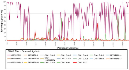 Recombination detection was performed on an alignment containing all available CHV-1 genomes in RDP ver 4.100 [24]. A PHI test demonstrated very good evidence of recombination in the alignment (p < 0.00001). Evidence for recombination between ELAL-1 and BTU-1 was abundant; RDP, GENECONV, Bootscan (Recscan), MaxChi and Chimaera supported this hypothesis. The results of a manual bootscan performed in RDP4 are shown in Figure 5. Manual bootscans were also performed for all other isolates versus the remaining isolates, with complete results shown in Table S2. Using this technique, multiple isolates did not demonstrate any evidence of recombination with other isolates, including all isolates shown in Figure 2b from the same outbreak in New York State in 2008 (ELAL-3, ELAL-4, ELAL-9, ELAL-10, ELAL-11, ELAL-14) as well as ELAL-6, ELAL-12, 0194 and 15-4016-NSW. The remaining Clade 1 isolates (ELAL-2, ELAL-5, ELAL-7, ELAL-8, ELAL-13 and ELAL-15, V1154, V777) all demonstrated some evidence of recombination with other Clade 1 isolates with bootstrap support of over 70%. There was no evidence of recombination between clades.