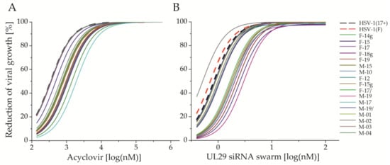 Inhibition of viral shedding in response to (A) acyclovir (ACV) or (B) UL29 siRNA swarm. The fitted curves represent circulating clinical (solid lines, N = 17) or reference strains (dashed lines, N = 2) of HSV-1. In all antiviral assays, Vero cells were treated with the antiviral agent on 96-well plates, infected 4 h post treatment (hpt) with 100 plaque forming units (pfu) per well, and finally quantified for reduction of viral production into the culture medium at 72 hpt. The dose is shown as log (nM) for both antivirals. The response is shown as inhibition percentage (%) in comparison to untreated cells for ACV and to water-treated cells for the UL29 siRNA swarm. The ACV plaque reduction assay was conducted in duplicates, and the antiviral siRNA swarm assay with five or more biological replicates for each concentration.