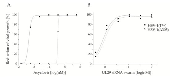 The thymidine kinase (UL23) defective HSV-1 strain (Δ305), and reduction of its growth in response to elevating concentrations of (A) acyclovir (ACV) or (B) UL29 siRNA swarm. HSV-1 (Δ305) is shown as a dotted line and triangles. The corresponding curve of the reference strain HSV-1 (17+) is shown with a solid line and squares. Both the UL29 siRNA swarm and ACV were studied for prophylactic efficacy, with treatment given four hours before infection. The assays were conducted on 96-well plates with a virus dose of 100 pfu per well. The dose is shown as log(nM) for both antivirals and the response is shown as inhibition percentage (%) versus untreated cells for ACV and versus water-treated for the UL29 siRNA swarm. The ACV plaque reduction assay was conducted in duplicates, and the antiviral siRNA swarm assay with five or more biological replicates for each concentration.