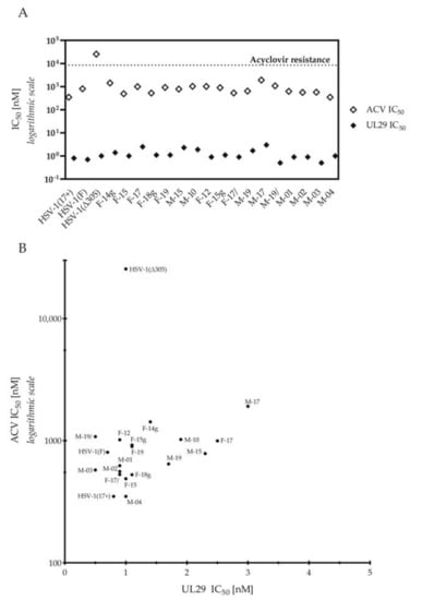 Comparison of the antiviral susceptibility of the strains. (A) Acyclovir (ACV) and UL29 RNAi sensitivities (IC50) of HSV-1 strains. The dotted line shows the limit of ACV resistance (1.9 µg/mL, 8.43 µM). (B) A scatter plot analysis for correlation of ACV and UL29 sensitivities. The sensitivity (IC50) of the HSV-1 strains for ACV is shown on the y-axis and for UL29 siRNA swarm shown on the x-axis. The values are shown as nM. ACV sensitivity is plotted in logarithmic scale. There was no significant correlation between the ACV sensitivities and UL29 siRNA swarm sensitivities of the circulating strains (p = 0.49) (Spearman’s r = 0.19).