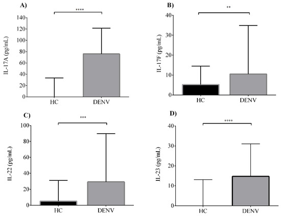 Elevated serum levels of interleukin 17A (IL-17A), IL-17F, IL-22 and IL-23 are produced in dengue infections. Serum levels of (A) IL-17A, (B) IL-17F, (C) IL-22 and (D) IL-23 in healthy controls (HC) (n = 78) compared with dengue virus (DENV)-infected patients (n = 128). Individual data are shown and the horizontal line is the median value. Statistical difference is based on the Mann–Whitney test. ** p < 0.01, *** p < 0.001, **** p < 0.0001.