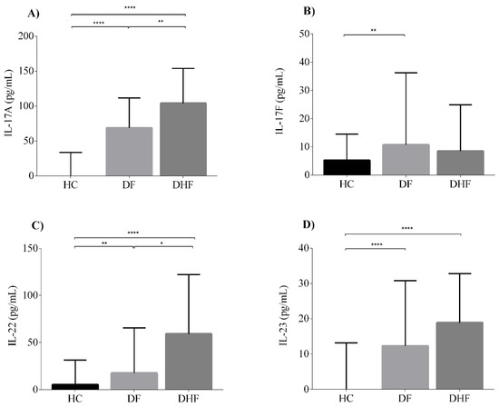 Little is known about the dynamics of IL-17-related cytokine production in the context of dengue pathogenesis. Furthermore, there is limited and contradictory scientific evidence for the potential role of IL-17A in dengue infection severity. Our group reported before the involvement of a Th17-related cytokine, IL-21, in the clinical course of DENV infections [37]. However, the dynamics of production and biological role for other related cytokines such as IL-17F, IL-22 and IL-23 have not been described. To clarify the involvement of all these related cytokine members in dengue infection pathogenesis, we performed a serum analysis for the IL-17 signature cytokines IL-17A, IL-17F, IL-22 and IL-23. We first compared the serum concentrations between dengue-infected patients and HC (Figure 1). Dengue patients showed elevated serum levels for IL-17A (median 76.0 pg/mL, IQR 24.6–121.4), IL-17F (median 10.5 pg/mL, IQR 2.1–34.9), IL-22 (median 29.3 pg/mL, IQR 0–89.8) and IL-23 (median 14.7 pg/mL, IQR 6.2–31.0) compared to HC (IL-17A, median 0 pg/mL, IQR 0–33.5; IL-17F, median 5.2 pg/mL, IQR 1.1–14.5; IL-22, median 5.2 pg/mL, IQR 0–31.2; and IL-23, median 0 pg/mL, IQR 0–13.1). Between dengue patients and the HC, there were statistically significant differences for all IL-17-related cytokines tested (p < 0.01).