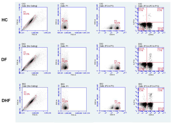 Strategy for IL-17-producing cell analysis. Dot plots are representative of one HC, DF and DHF patient. Ten thousand events were acquired from lymphocyte regions based on CD3-FITC staining. Percentages of IL-17-producing cells were identified in the CD4+ and CD4- region with the quadrants established based on isotype controls. CD3+ CD4+ IL-17+ cells were considered to be Th17 cells mainly.
