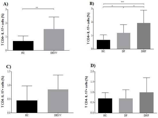 In contrast, no differences were found in the percentage of CD4-IL-17-producing cells, either in DENV-infected patients relative to HC (p = 0.2192), or among clinical severities (p = 0.2952) (Figure 6C,D).