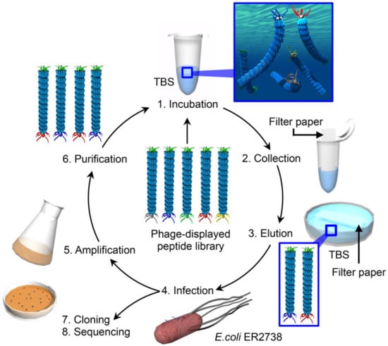 - Günay, K.; Klok, H.-A. Identification of Soft Matter Binding Peptide Ligands Using Phage Display. Bioconjugate Chem. 2015, 26, 2002–2015. [Google Scholar] [CrossRef] [PubMed]