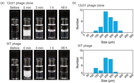 WT M13 phage was expressed using the Ph.D. Peptide Display Cloning System without any modification of DNA. A total of 400 µL of aqueous M13 phage solution (15 or 150 nM) was mixed with 400 µL of toluene followed by shaking the mixture by hand for 30 s according to a previously reported method [35]. The prepared emulsions were incubated at 25 °C. The emulsion size was determined by utilizing ImageJ software (version 1.52, developed at the National Institutes of Health, Bethesda, MD, USA) using a photograph taken by a digital microscope (QX800HD 720P 3D, AsOne, Osaka, Japan).
