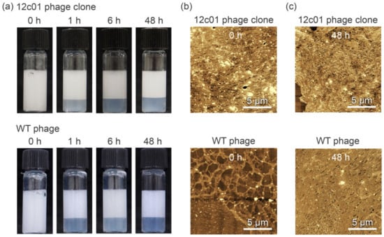 (a) Optical photographs of emulsions formed with the 12c01 phage clone and WT phages (each 150 nM). (b,c) Morphological characterization of the emulsion droplet surfaces. The emulsions prepared with the 12c01 phage clone and WT phages were observed immediately after emulsification (b) and 48 h later (c).