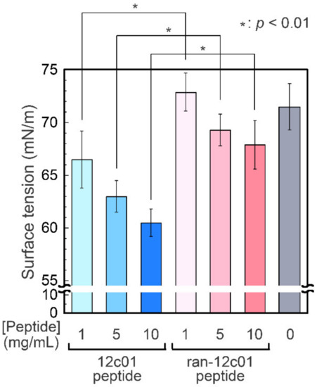 The surface tension of the peptide solutions was determined by conducting pendant drop tensiometry. The surface tension value of the 12c01 peptide solution was lower than that of ultrapure water and decreased with increasing peptide concentration (Figure 4), demonstrating certain surface activity of the 12c01 peptide. On the other hand, the ran-12c01 peptide did not lower the value of the surface tension (which was the same as that for the ultrapure water within experimental error), showing the essential role of the amino acid sequence of the 12c01 peptide on the surface activity. The surface tension values were unchanged during incubation for several hours. Therefore, the decreased surface tension was due to immediate adsorption of the 12c01 peptide onto the air–liquid interfaces. Unfortunately, although the minimum surface tension value measured in this study was 60.5 ± 1.3 mN/m (10 mg/mL for the 12c01 peptide), which is greater than that obtained for typical synthetic surfactants and biosurfactants (ranging from 20 to 60 mN/m) at the same concentrations [42], a certain surface activity of the screened peptide was observed for the first time. These results demonstrate that the 12c01 peptide can accumulate at the air–liquid interface, lowering surface tension as a surfactant, even though the peptide is freed from phages.