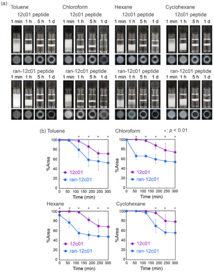 The capability of the 12c01 peptide as a surfactant was determined via emulsification using toluene, chloroform, hexane, and cyclohexane as organic phases (Figure 5a). Emulsions were successfully prepared with all the organic solvents used in this study and maintained for at least one day, indicating certain surface activity as surfactants. The stability of the emulsions prepared with the 12c01 peptide was compared with those prepared with the ran-12c01 peptide using the coverage areas for the emulsions (Figure 5b). In all the organic solvents, the quantity of emulsions prepared with the 12c01 peptide was greater than those prepared with the ran-12c01 peptide, demonstrating essential roles of the amino acid sequence in emulsification. The orders of stability for emulsions prepared with the 12c01 peptide and the ran-12c01 peptide were cyclohexane > chloroform > toluene ≈ hexane and cyclohexane > toluene > hexane > chloroform, respectively. Because the order of these stabilities did not appear to be related to the parameters for the organic solvents [43,44,45,46], we considered that the order was determined by the affinity of side chains of each peptide for water and organic solvents. Additionally, because the stability was different depending on the amino acid sequences, simple hydrophobicity based on amino acid compositions in the peptide did not affect emulsion formation and stability. These results indicated that the amino acid sequence of the screened 12c01 peptide acted as an emulsifier to form stable emulsions through its inherent surface activity.
