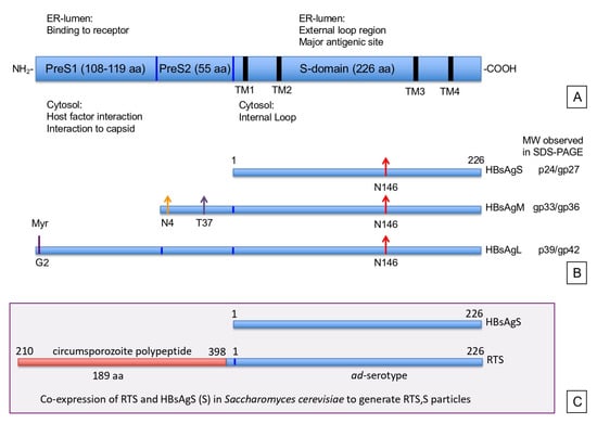 The surface (envelope) proteins (HBsAg) of hepatitis B virus (HBV): (A) The open reading frame encoding the complete hepatitis B surface antigen is depicted. The domain organization of preS1, preS2, and S, with the number of amino acids (aa) of the individual domains are specified. The four transmembrane regions (TM1–4) are indicated by the thick black lines. The function of the different domains in relation to their orientation towards the lumen of the endoplasmic reticulum (ER) or cytosol is indicated. (B) The individual HBsAg open reading frames for the small (HBsAgS), middle (HBsAgM), and large (HBsAgL) proteins, and their post-translational modifications are shown. The size of the HBsAgS protein is indicated by the number of amino acids. Arrows represent the utilized glycosylation sites. Red arrows mark asparagine 146 (N146) in the S-domain. Orange and purple arrows represent the N-4 and threonine 37 (T37) respectively, in the preS2 domain. The glycine residue at position 2 (G2) of the preS1 domain, indicated by a purple line, is myristolated. The observed molecular weights (MW) of the glycosylated (gp) and non-glycosylated proteins (p) separated under reducing conditions on a SDS-PAGE are indicated on the right. (C) Design of the RTS,S vaccine that is produced by co-expressing HBsAgS (aa 1–226) and the chimeric protein that is a fusion of the circumsporozoite polypeptide (210–398 aa) to the N-terminus of HBsAgS, including 4 aa from the preS2 domain.