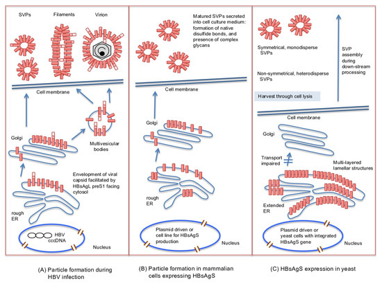 Illustration of HBsAg protein synthesis and assembly pathways during a natural infection (A), HBsAgS expression and assembly in mammalian cells in the absence of other viral gene products (B), or expressed in yeast (C). During a natural infection, virions and filaments are formed by budding from multivesicular bodies. The spherical subviral particles (SVPs) are produced and secreted through the endoplasmic reticulum (ER)-Golgi complex. The HBsAg subunits of the virions, filaments, and SVPs form intra- and intermolecular disulfide bonds, and are partially glycosylated (not shown) (A). Expression of the HBsAgS gene in mammalian cell lines leads to the formation of SVPs exclusively composed of HBsAgS permitting the formation of disulfide bonds and partial glycosylation (not shown) (B). HBsAgS protein expressed in yeast accumulates in the ER, causes an extended ER and forms multilayered lamellar structures. HBsAgS protein complexes are harvested from the cell lysate, and SVPs are assembled during down-stream processing (C). cccDNA: covalently closed circular DNA.