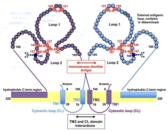 An essential step in the formation of virions, filaments, or SVPs is the cotranslational insertion of the HBsAgS protein into the membrane of the endoplasmic reticulum (ER) with a short luminal exposed N-terminal sequence, two transmembrane regions separated by a cytosolic loop, and a luminal domain, followed by a hydrophobic C-terminal region. The luminal domain corresponds to the external loop region of the S-domain, which contains multiple epitopes, including the immunodominant “a”-determinant region that is common to all HBV genotypes, and the allelic antigenic determinants “d/y” and “w/r” [,]. A conformational heparan sulfate binding site also overlaps with the “a”-determinant region and is essential to infectivity [].