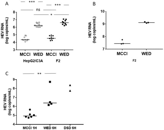 Thus, the ranges of nHEV and eHEV values did not overlap when cells were cultured in the same conditions, and nHEV was more infective than eHEV (p < 0.05 for MCCI or WED conditions) (Figure 2).
