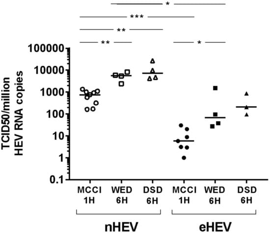 HEV3 RNA infectivity in different culture conditions. Tissue culture infectious dose 50 (TCID50) per million HEV RNA copies calculated for nHEV3 (empty symbols) and from the first-passage supernatant culture of the same strain on PLC/PRF/5 cells, eHEV3 (filled symbols). Successive ten-fold dilutions of the viral suspensions were used to inoculate HepG2/C3A cells, either during 1-h at room temperature in MCCI medium (circles) or for 6 h at 35.5 °C in WED (squares) or DSD (triangles) medium. Cells were maintained in the same medium until day 10. The horizontal bars represent medians with range. * p < 0.05. ** p < 0.01. *** p < 0.001.