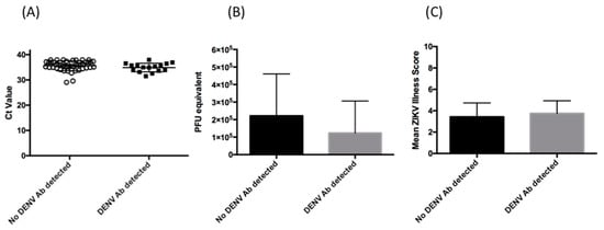Relative magnitude of viremia and disease severity. (A) ZIKV RNA Ct values as a measure of viremia in patients who were DENV PRNT negative (black circles) and those with evidence of DENV or flavivirus exposure, based on DENV PRNT (black squares). The lines represent the mean and error bars represent standard deviation. (B) PFU equivalents as in interpolated from Ct values. The bars represent the means, and error bars represent standard deviation. (C)Mean Zika illness score for patients. The total number of symptoms for patients with (grey bars) or without (black bars) previous serological evidence of DENV exposure was determined and used to generate a disease severity score. The error bars represent standard deviation. Additionally, as shown in Table 1, the majority of patients were tested for the presence of DENV and CHKV IgM and/or RNA. Overall, this suggests that viremia did not differ between the two groups.