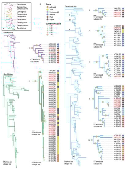 - Varsani, A.; Krupovic, M. Sequence-based taxonomic framework for the classification of uncultured single-stranded DNA viruses of the family Genomoviridae. Virus Evol. 2017, 3, vew037. [Google Scholar] [CrossRef] [PubMed]