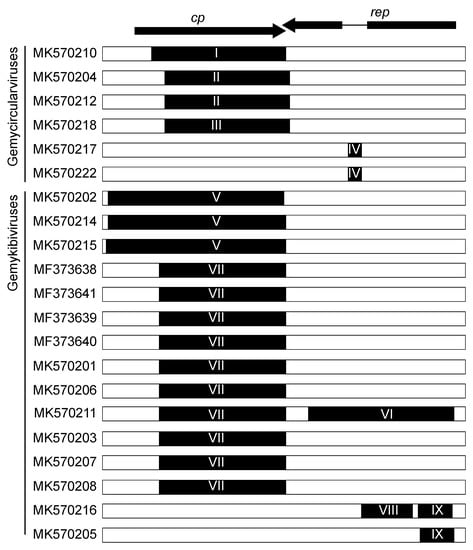 Illustration of the nine events of recombination detected by RDP4 in the genomes of gemycircularviruses (n = 6) and gemykibiviruses (n = 15). The black regions depict the recombinant region, with I–IX denoting the recombination events (see Table 3 for details of recombination). The genome organization of genomoviruses is provided at the top showing the cp and rep genes.