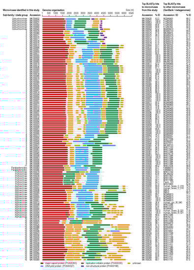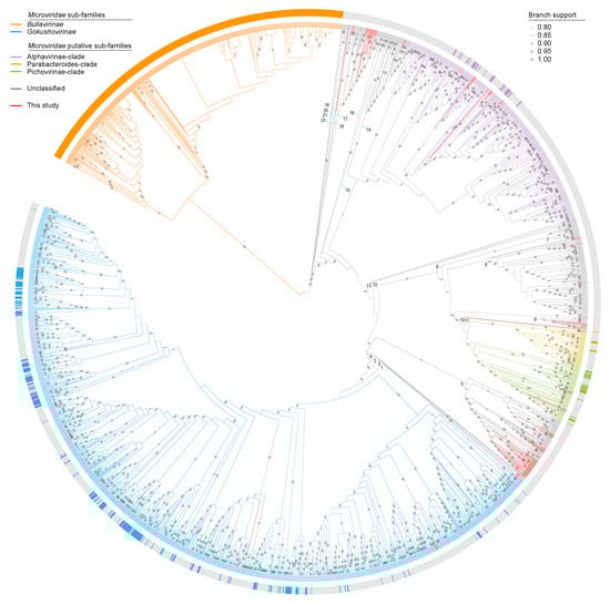 The following are available online at https://www.mdpi.com/1999-4915/12/2/143/s1, Supplementary Figure 1: Approximately Maximum-Likelihood cladogram of the MCP sequences (n = 2797). Branches are color coded based on sub-families (Bullavirinae and Gokushovirinae) and Alphaviriniae-, Parabacterioides- and Pichovirinae-clades. In addition to these, 22 unique clades are marked with number. Branches in grey represent an additional nine singletons and 13 clades. Branches in red denote sequences identified in this study. The outer circle represents taxa with some level of classification assigned prior to this study. Branch support with >0.8 aLRT is shown. Taxa names and assignment are provided in Supplementary Data 1. Supplementary Figure 2: Approximately Maximum-Likelihood phylogram of the MCP sequences (n = 2797). Branches are color coded based on sub-families (Bullavirinae and Gokushovirinae) and Alphaviriniae-, Parabacterioides- and Pichovirinae-clades. Branches in grey represent an additional nine singletons and 13 clades. Branches in red denote sequences identified in this study. The outer circle represents taxa with some level of classification assigned prior to this study. Branch support with >0.8 aLRT is shown. Taxa names and assignment are provided in Supplementary Data 1. Supplementary Table 1: Details of abutting primers used to recover the full genomes of genomoviruses and unclassified CRESS DNA viruses for this study. Supplementary Data 1: Summary of microviruses whose MCPs were used to generate the phylogeny presented in Figure 5 and Supplementary Figures S1 and S2. Detailed of accession number, sub-family/putative sub-families (based on phylogeny presented in this study), genome length, country of identification, and isolation source are provided.