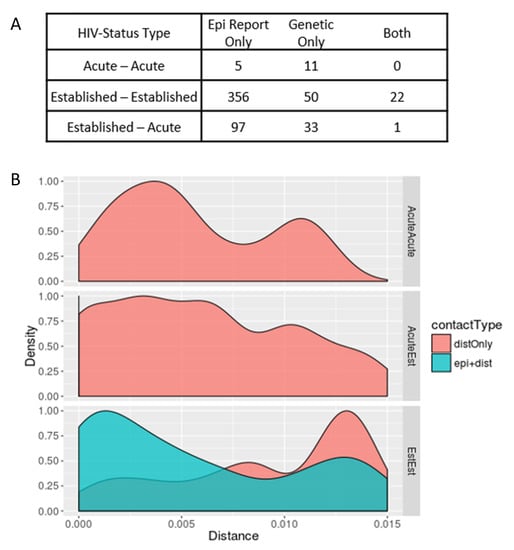 We next compared the genetic distance (d) distributions (0 < d < 1.5%) for each category of putative transmission link between participants. There were no epi links between persons with AHI that were also supported by genetic evidence, but the distribution of Acute–Acute links is bimodal, with most occurring either below a genetic distance of 0.5% or above 1.0% (Figure 1B). Most of the genetic links between persons with established HIV infection (Established–Established) that were supported by an epi link fell below 0.5% (n = 13/23, 59.1%), whereas those without epi support were beyond 1.0% (n = 58/73, 79.5%). It is important to note that, barring mixed infections, the duration of AHI is insufficient for HIV to accrue sufficient genetic changes to achieve such distances > 1.0%. While the study was conducted over a three-year period, under normal circumstances this period remains insufficient to accrue such genetic distances between two acute cases. Therefore, links between persons with AHI where d > 1.0% are not likely to represent direct transmissions (n = 3/12, 25.0%), suggesting the presence of unobserved transmission intermediaries that might be elucidated by more robust contact tracing efforts. In contrast, close genetic links between persons with a supporting epidemiologic report are more likely to represent direct transmission partners. All putative transmission links between persons with AHI exhibited evidence of transmitted DRAM, where DRAMs were symmetrically distributed across each close genetic link. Notably, all putative transmission links between persons with acute HIV infection were unsupported by partner elicitation and occurred among large clusters (size ≥ 5).
