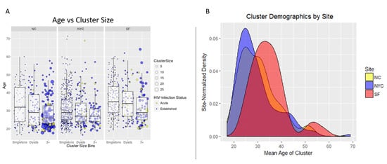 The distribution of sexual network sizes varied across sampling sites, with small components of singletons (size = 1) and dyads (size = 2) most frequently found in SF and NYC (Table 2). Overall, as cluster size increased, the mean age of cluster members decreased (Figure 2A). Each site had bi-modal distributions of mean cluster age, where the second peak occurred at ≥50 years (Figure 2A,B). Notably, ages at individual- and cluster-levels in SF were right-shifted by approximately 10 years, indicating an older participant population, regardless of cluster size (Figure 2B). Each site had a single high-risk sexual network consisting of >10 members, but NC had the most sexual networks that consisted of at least five members (Figure 3). The largest network in NC (n = 26) was more than twice the size of the largest networks across all sites. Notably, all members of the two largest (size ≥ 5) SF networks exhibited transmitted drug resistance (TDR) and named zero high-risk partners. Two networks consisting of 2- and 4-members were inter-site, with members from NYC and SF. Inter-jurisdictional networks, dyads or larger networks representing more than one US state (n = 221, 77.5%) were three times more common than clusters involving only a single US jurisdiction.