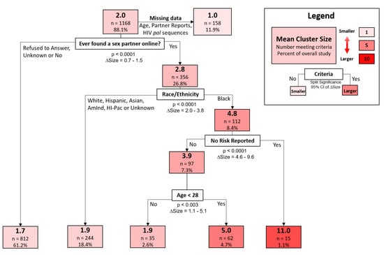 A decision-tree model was used to classify cluster sizes according to participant demographic and behavioral traits. The strongest discriminator of increased cluster size, representing the first split of the decision tree, was whether a participant reporting meeting sexual partners online (95% confidence interval of size difference [CISD] = 0.7–1.5, p < 0.0001) (Figure 4). Black participants who met partners online were found in larger clusters (mean size = 4.8, n = 112) than all other races that also met partners online (mean size = 1.9, n = 244) (95% CISD = 2.0–3.8, p < 0.0001). Those found among the largest clusters were black participants who met sexual partners online but reported no risk factors during the interview (mean size = 11.0, n = 15). In contrast, black individuals who met partners online but did report risk factors were in substantially smaller clusters (mean size = 3.9, n = 97) (95% CISD = 4.6–9.6, p < 0.0001). Finally, young black participants (age < 28, mean size = 5.0, n = 62) that reported high-risk behavior and meeting partners online were found in larger clusters than their older counterparts (age > 28, mean size = 1.9, n = 35) (95% CISD = 1.1–5.1, p < 0.003).