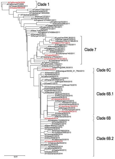 The phylogenetic tree of A(H1N1)pdm09 virus was constructed using 124 whole amino acid sequences of hemagglutinin (HA) protein by the neighbor-joining method with Kimura distances and the 1000 replicates bootstrap using ClustalW 1.83 on the DDBJ (DNA Data Bank of Japan) website (http://clustalw.ddbj.nig.ac.jp/). The HA sequence of A/California/04/2009 was used as the outgroup to root the tree. The HA sequences of the A(H1N1)pdm09 isolates were obtained from the EpiFlu database (https://www.gisaid.org/), and the HA genetic clades were determined based on representative isolates of each clade available through the EpiFlu database.