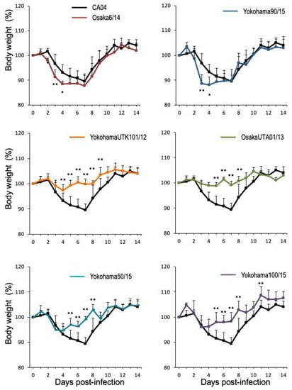 Body weight changes of mice infected with Japanese isolates or with CA04/09. Mice (five per group) were infected intranasally with 105 PFU of each virus. Asterisks indicate the timepoints at which mice infected with Japanese isolates showed greater or smaller body weight loss than mice infected with CA04/09 (*, p < 0.05; **, p < 0.01).