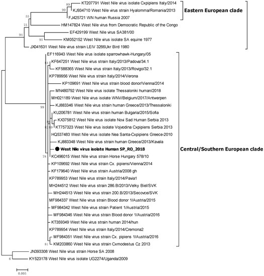 A maximum likelihood phylogenetic tree using the selected TN93 + G model was constructed and it showed that the WNV-2 strain amplified in this study clustered into the Central/Southern European WNV lineage 2 clade, which was detected in Romania for the first time in 2015 (Figure 1). In 2016, early amplification of the emerged WNV, and complete replacement in mosquito populations of the previously endemized virus in Southeastern Romania occurred and these events were associated with a human outbreak of severe WNV disease [13]. The result obtained in this work reflect that this strain is still circulating now in this country. The phylogenetic analysis shared the highest nucleotide similarity (over 99%) with several strains circulating in Greece, Belgium and Hungary in recent years.
