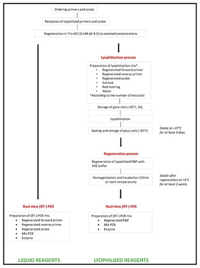Real-time molecular techniques have become the reference methods for direct diagnosis of pathogens. The reduction of steps is a key factor in order to decrease the risk of human errors resulting in invalid series and delayed results. We describe here a process of preparation of oligonucleotide primers and hydrolysis probe in a single tube at predefined optimized concentrations that are stabilized via lyophilization (Lyoph-P&P). Lyoph-P&P was compared versus the classic protocol using extemporaneously prepared liquid reagents using (i) sensitivity study, (ii) long-term stability at 4 °C, and (iii) long-term stability at 37 °C mimicking transportation without cold chain. Two previously published molecular assays were selected for this study. They target two emerging viruses that are listed on the blueprint of the WHO as to be considered for preparedness and response actions: chikungunya virus (CHIKV) and Rift Valley fever phlebovirus (RVFV). Results of our study demonstrate that (i) Lyoph-P&P is stable for at least 4 days at 37 °C supporting shipping without the need of cold chain, (ii) Lyoph-P&P rehydrated solution is stable at +4 °C for at least two weeks, (iii) sensitivity observed with Lyoph-P&P is at least equal to, often better than, that observed with liquid formulation, (iv) validation of results observed with low-copy specimens is rendered easier by higher fluorescence level. In conclusion, Lyoph-P&P holds several advantages over extemporaneously preparer liquid formulation that merit to be considered when a novel real-time molecular assay is implemented in a laboratory in charge of routine diagnostic activity.