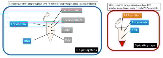PCR/RT-PCR mix preparation using the extemporaneous formulation versus Lyoph-P&P method.