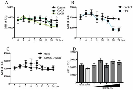 IFNα receptor signaling does not diminish E2-2 expression. PBMCs were treated with 5 ug/mL of CpGA or CpGB (A), 200 ng/mL lipopolysaccharide (LPS), (B) or 5000 IU recombinant IFNα2b (C) for up to 24 h. (D) PBMCs were treated with 10, 100, 1000, 5000, or 10,000 IU of IFNα2b for 24 h. n = 5 independent experiments. Data are presented as means ± SEM. p values < 0.05 were considered significant. * p < 0.05, ** p < 0.01, *** p < 0.001.