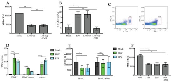 To determine if cytokines present in the supernatants of TLR-activated PBMCs are sufficient to induce downregulation of E2-2 in pDCs during stimulation, we cultured enriched pDCs with supernatants collected from PBMCs stimulated with LPS. These supernatants resulted in the downregulation of E2-2 (Figure 5A). To rule out the possibility that LPS in the supernatants was responsible for the downregulation of E2-2, supernatants were treated with polymyxin B, which prevents LPS binding to TLR4 and the activation of pDCs []. Downregulation of E2-2 did occur when supernatants were pretreated with polymyxin B (Figure 5B). To ensure that polymyxin B prevented LPS activating pDCs directly, we measured upregulation of TLR4 on pDCs. Stimulation with LPS and supernatant caused a significant increase in the percent of pDCs expressing TLR4. As we have previously reported [], treatment with polymyxin B prevented upregulation of TLR4 (Figure 4F). These results indicate that E2-2 downregulation is not specific to TLR stimulation, but rather a response to the milieu of cytokines present in the media.