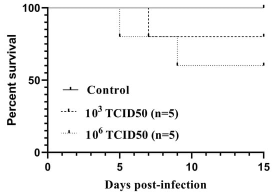 Kaplan–Meier survival curves for canaries intraperitoneally inoculated with 103TCID50 (n = 5) or 106TCID50 (n = 5) of the Usutu virus.