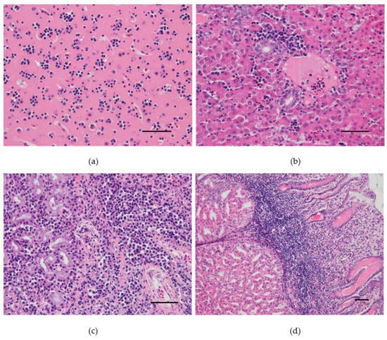 The following are available online at https://www.mdpi.com/1999-4915/12/2/164/s1, Figure S1: Cerebral cortex of canary 4 (a, low dose) and canary 2 (b, high dose). Satellitosis: Foci of neuroglia around degenerating/apoptotic neurons. Figure S2: Liver of canary 2 (high dose). (a) Periportal hepatitis (b) Focal hepatitis and necrosis. Figure S3: Proventriculus of canary 4 (low dose). Lymphoplasmacytic and histiocytic infiltrates in the lamina propria. Scale bars: 50 µm.