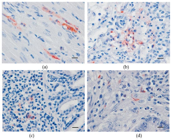 Immunohistochemical labeling of Usutu virus antigens in experimentally infected canaries using a mix of 4E9 and 4G2 anti-E protein monoclonal antibodies. Red-brown staining in antigen-positive cells from the heart (a), lung (b), lachrymal gland (c), and small intestine (d). Mayer hematoxylin counterstain, Scale bars: 10 µm.