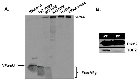 We carried out an initial characterization of the TDP2 WT and KO RPE-1 cell lines to confirm that both VPg unlinkase activity and TDP2 protein expression are absent in the KO cells (Figure 2). To test the former, we used a rapid, in vitro VPg unlinkase assay developed by Rozovics et al. [] that relies on a 35S-methionine (35S-met)-labelled virion RNA substrate. Poliovirus engineered to contain two extra methionine residues in the VPg polypeptide sequence [] was grown in the presence of 35S-met, allowing the VPg to be radiolabeled. The labelled RNA was isolated and subsequently incubated with a source of TDP2/VPg unlinkase (either recombinant protein or whole cell lysates). The entire reaction mix was then subjected to electrophoresis on an SDS-containing, 13.5% polyacrylamide gel in Tris-tricine buffer and analyzed by autoradiography. Released VPg can be observed as a radioactive signal migrating towards the bottom of the gel. As expected, we observed that cell lysates generated from WT TDP2 hRPE-1 cells possess VPg unlinkase activity (Figure 2A, lane 3), while those generated from KO TDP2 cells do not (Figure 2A, lane 4). As a positive control, we used recombinant WT TDP2 (Figure 2A, lane 2). For a negative control, we used a catalytically inactive version of the enzyme containing an alanine substitution at His351 (Figure 2A, lane 5), which has been shown previously to abolish TDP2 5′ phosphodiesterase activity []. To control for non-specific, non-phosphodiesterase-mediated release of VPg, we treated the radiolabeled substrate with RNAse A (Figure 2A, lane 1), which generates VPg-pU and therefore migrates with a higher molecular mass than VPg alone. We also determined by Western blot analysis that TDP2 protein expression is absent in hRPE-1 TDP2 KO cells compared to WT (Figure 2B). Altogether, these data confirm that hRPE1 TDP2 KO cells are devoid of detectable TDP2/VPg unlinkase activity and protein expression.