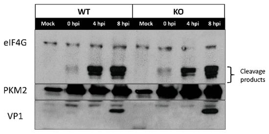 As mentioned above, it has been demonstrated that host cap-dependent translation is not shut off during CVB3 infection of MEF cells. This is noteworthy because ongoing host translation during the virus infection increases the competition between virus and host mRNAs for ribosomes and other translation initiation factors [], which has the potential to make the overall virus replication cycle inefficient. As such, it could be difficult to parse out the effect of TDP2 KO on virus replication vs. the inherent inefficiency of picornavirus translation in mouse cells. This was a key factor in our decision to develop the hRPE-1 cell model of infection. Therefore, we examined whether host translation is shut off during picornavirus infection of hRPE-1 cells to determine if the growth defect we observed was due to an indirect effect of host competition for translation resources. We either infected or mock-infected the WT and KO TDP2 cell lines with poliovirus and generated extracts at 0, 4, or 8 hpi. Using Western blot analysis, we assayed for the cleavage of the eukaryotic initiation factor, eIF4G. Poliovirus 2Apro-mediated proteolysis of eIF4G is required for host translation shut-off [] and is routinely used as a read-out for this step. As displayed in Figure 5, eIF4G cleavage products could be detected as early as 30 min post-infection (after the virus adsorption period, indicated as 0 hpi time points in Figure 5) and were the most prominent at 8 hpi for both the WT and KO TDP2 cell lines.