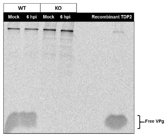 An alternative source of VPg unlinkase activity is not activated at late times of infection in TDP2 KO hRPE-1 cells. WT and KO TDP2 hRPE cells were infected or mock-infected with poliovirus at an MOI of 3 and harvested at 6 hpi. Cell lysates were prepared and VPg unlinkase assay was carried out as indicated in the legend to Figure 2. Recombinant WT TDP2 was used as a positive control.