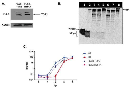 In addition to DNA repair, TDP2 has other roles in the uninfected cell []. Several of the pathways in which TDP2 is involved have been shown to also play roles in picornavirus replication. For example, overexpression of TDP2 has been demonstrated to activate the MAPK-ERK signal cascade resulting in an increase in cell proliferation []. Additionally, it is known that efficient CVB3 replication is dependent on the activation of the MAPK-ERK pathway [,] and is also influenced by the cell cycle []. Furthermore, TDP2 blocks the activation of the NF-κB pathway via its interactions with the CD40 receptor and TRAF6 [], and several picornaviruses including poliovirus, HRV14, echovirus 1 [] and EV71 [] have also been shown to downregulate NF-κB signaling by targeting either the p65-RelA subunit of the NF-κB complex for 3Cpro-mediated degradation, or by blocking IKKβ activation through interactions with 2C to promote virus replication []. Thus, it is possible that a function of TDP2 which is independent of its 5′ phosphodiesterase activity might be involved in picornavirus replication and could therefore be responsible for the growth defect we observed in TDP2 KO hRPE cells. To test this possibility, we generated hRPE cell lines that constitutively express FLAG-tagged versions of either WT TDP2 (FLAG-TDP2) or the catalytically inactive protein containing the H351A mutation (FLAG-H351A) described previously (refer to Figure 2). These cell lines were created using the CRISPR TDP2 KO cells as the backbone. We determined the relative protein expression level of FLAG-TDP2 and FLAG-H351A in the complemented cells by Western blot analysis (Figure 7A) and chose clones which had comparable recombinant TDP2 protein expression levels for the remainder of our studies. We assessed the levels of VPg unlinkase activity in both cell lines. As expected, lysates of FLAG-TDP2-expressing cells (Figure 7B, lane 4) were able to hydrolyze VPg from the RNA similarly to lysates from WT cells (Figure 7B, lane 3), while those from FLAG-H351A-expressing cells were not (Figure 7B, lane 7), and VPg unlinkase activity was comparable to that of KO TDP2 cells. (Figure 7B, lane 6). As positive and negative controls for this experiment, we used recombinant GST-tagged TDP2 and vRNA alone (Figure 7B, lanes 2 and 8, respectively). We next infected both cell lines (FLAG-TDP2 and FLAG-H351A) with poliovirus and included either WT or KO TDP2 cells as positive and negative controls, respectively. Single cycle growth analysis allowed us to determine if catalytically inactive TDP2 is able to rescue the delay in virus production observed in TDP2 KO cells, suggesting that other functions of TDP2 (aside from its DNA repair activity) may be playing a role in the virus replication cycle. However, we observed that the catalytically inactive version of TDP2 is unable to rescue virus replication (Figure 7C, dashed red line) and that growth kinetics are comparable to those in the negative control. In contrast, consistent with previously published results [] FLAG-TDP2 can rescue the virus growth defect (Figure 7C, dashed blue line), and titers are similar to those from WT TDP2 cells. Our data demonstrate that TDP2 5′ phosphodiesterase activity is important for efficient poliovirus replication and most likely acts directly on VPg-linked RNA. However, it is important to note that this experiment does not rule out the possibility that there are other cellular pathways which are activated by TDP2 enzymatic activity that picornaviruses also require to carry out their replication cycles. Such putative pathways have yet to be described, and the signal cascades mentioned above rely only on TDP2 activation via protein-protein interactions and not its enzymatic activity. Given the unique DNA/RNA-protein linkages upon which TDP2 acts, it is unlikely that this activity is used to activate a signaling pathway directly.