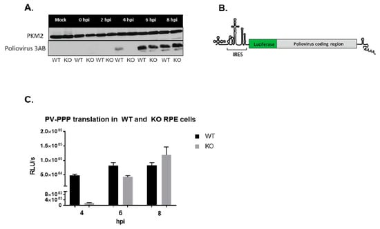 Poliovirus protein production is delayed in the absence of TDP2 in hRPE-1 cells. (A) Western blot analysis of poliovirus-infected WT and KO hRPE-1 cells. Cells were infected with poliovirus and harvested at the indicated times. Lysates were prepared as described in the legend to Figure 5. Poliovirus 3AB protein expression was detected using a mouse monoclonal antibody against 3A (generously provided by George Belov, University of Maryland), which also recognizes the precursor protein, 3AB. PKM2 expression was used as a loading control. (B) Schematic of the Renilla luciferase reporter virus construct, PV-PPP []. (C) Quantitation of luciferase production by PV-PPP in WT and KO TDP2 hRPE-1. Cells were infected with 200 µL of inoculum containing PV-PPP (MOI 0.01) and incubated at 37 °C for the indicated time periods. Cells were lysed using Passive Lysis Buffer (Promega) and luciferase activity was determined using a luminometer. Values are presented as Relative Luminometer Units (RLU) per second. PV-PPP construct was generously provided by Eckard Wimmer, Stony Brook University. Error bars represent the standard deviation of the results obtained from three biological replicates.