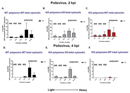 Polysomes can assemble efficiently on VPg-linked RNA after the initial round of translation in cultured cells, but viral RNA fails to amplify at mid-times of infection. Polysome analysis of WT or KO TDP2 hRPE-1 cells infected with poliovirus at an MOI of 3 collected at 2 hpi (A–C) or 4 hpi (D–F). Infected cells were treated with 30 mg/mL of cycloheximide for 3 min then lysed in polysome lysis buffer on ice for 30 min. Lysate was then layered onto a continuous 10–50% sucrose gradient. Gradients were centrifugated at 30,000 RPM in an SW41 swinging bucket rotor for 2 h at 4 °C and subjected to polysome fractionation at 4 °C. RNA was purified, and qRT-PCR analysis was carried out to quantitate viral RNA present in each fraction. Values obtained for each set of pooled fractions are standardized to GAPDH mRNA levels and are represented as the normalized value relative to viral RNA present in the total unfractionated, cytoplasmic sample generated from WT (A,C,D,F) or KO (B,E) TDP2 hRPE-1 cells.