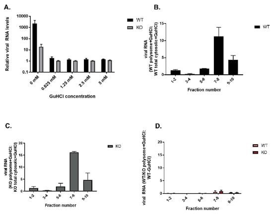 Polysomes can assemble efficiently in the absence of genome amplification. (A) Treatment of poliovirus-infected WT and KO hRPE cells with increasing concentrations of GuHCl. Cells were harvested at 4 hpi. (B–D) Polysome analysis as carried out in Figure 9 except that cells were treated with 2.5 mM GuHCl to inhibit viral RNA synthesis. In panel (D), polysome-associated viral RNA collected from WT or KO hRPE cells treated with GuHCl is represented as a ratio of the total cytosolic viral RNA collected from mock-treated, poliovirus-infected WT cells.