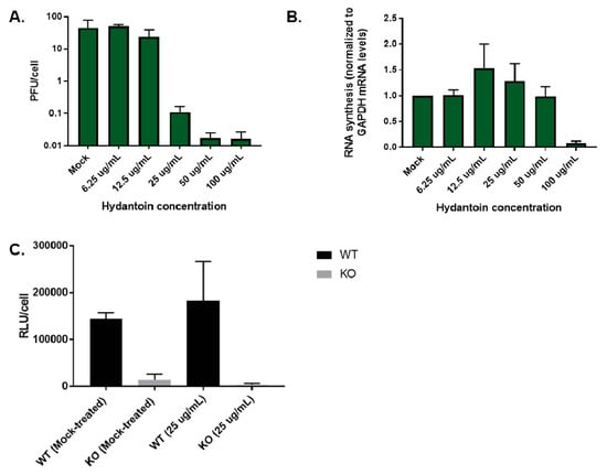 WT TDP2 hRPE cells were seeded into 6-well plates at a density of 2.5 × 105. Virus infections were carried out as previously described in “Virus Infections and Single Cycle Growth Analysis” section in the presence of 6.25, 12.5, 25, 50, or 100 µg/mL of Hydantoin or DMSO alone as a negative control. Cells were subsequently harvested 6 h post-infection and analyzed for infectious particle production by plaque assay or for RNA production by qRT-PCR.