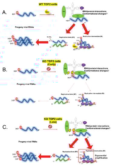 When TDP2 was first discovered as VPg unlinkase, it was proposed that removal of VPg early on during the replication cycle might act to prevent nascent RNA from being packaged prematurely [,]. This would result in an early boost in virus particle production in TDP2 KO cells compared to WT followed by an immediate plateau (i.e., logarithmic growth). However, this growth pattern has never been observed. It is possible that a delay in virus particle production caused by premature encapsidation might also eventually be overcome in the absence of TDP2, leading to the phenotype that we observe in hRPE-1 cells. Our data demonstrated that the delay in protein production that occurs at mid-times of infection in the absence of TDP2 is not rescued by blocking RNA packaging using the inhibitor hydantoin, suggesting that encapsidation of VPg-linked RNA is not responsible for the phenotype. Instead, we propose that the presence of VPg at the 5′ end of the RNA might hinder the formation of the PCBP2/3CD RNP complex at the cloverleaf structure, a step that is required for both positive and negative-strand RNA synthesis. Our model for this scenario is depicted in Figure 14.