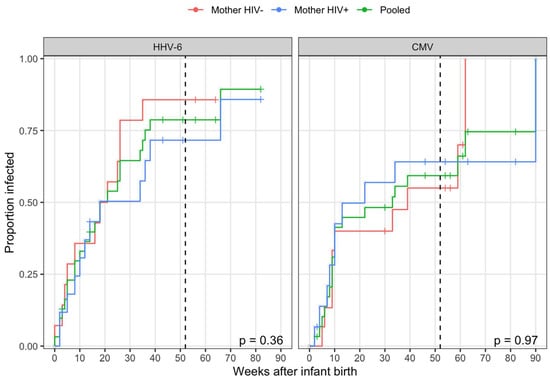 Time taken for the transmission of human herpesvirus 6 (HHV-6) and cytomegalovirus (CMV). Cumulative incidence curves for all transmission events to infants following birth stratified by maternal HIV status with censoring denoted by a plus. The P-values from log-rank tests comparing survival curves (one minus proportion infected) between infants with HIV+ and HIV- mothers are displayed in the bottom-right of each panel. The household exposure information was collected through one year (52 weeks; vertical, dashed black line). All events occurring after one year were right-censored for an estimation of transmission risk.