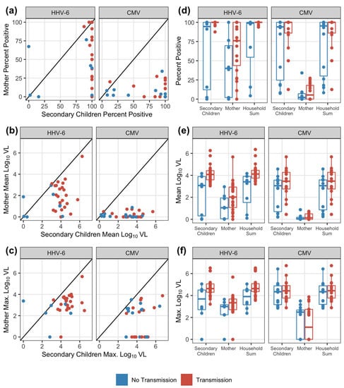 Comparisons of exposure patterns across households and among household members. Comparing viral exposure patterns for HHV-6 and CMV between mother and secondary children within a household by (a) percent positive weekly swab measurements; (b) mean log viral load (VL; DNA copies/mL); and (c) maximum log viral load. The diagonal line in the scatterplot denotes equivalent summary measures between household mother and secondary children (i.e., the points below the line indicate lower measurements from the household mother). Shedding patterns by exposure source compared between households without and with transmission by (d) the percent of positive weekly measurements; (e) the mean log viral load; and (f) the maximum log viral load. Boxes represent the interquartile range, stems represent values within 1.5 of the IQR, and points represent the raw data. All observed exposures measured in the infant’s first year of life and prior to transmission times are shown.