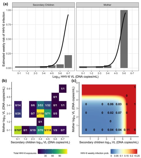 Estimation of HHV-6 acquisition risk from exposures by week using the combined exposure model (Table 2 and Table A1). (a) Individual HHV-6 dose–response relationship for mother and secondary children oral viral load (VL, DNA copies/mL) exposures where bars depict the percentage of infections observed among total exposures in the data and lines depict estimated risk from the model. (b) A heatmap depicting the distribution of total combined exposures in a given viral load bin from mothers and secondary children in a household. The text depicts the fraction of total infections over total exposures. (c) A heatmap depicting the risk of HHV-6 infection from combined household mother and secondary children exposures estimated from the model. The text depicts the proportion of infections observed in the data using binned viral loads from (b) (equivalent to fraction displayed).