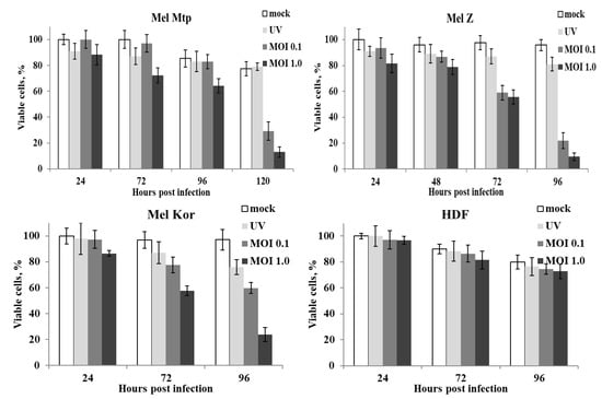 To quantify the virus-induced effect, the percentage of viable cells was estimated at indicated time points during a 120 h MV-infected cell cultivation period by measuring the activity of mitochondrial metabolism in MTT assay (Figure 2). Three out of five melanoma cell lines, mel Il, mel Ibr and mel Z, were eliminated after 96 h post infection even at a low MOI, while two cell lines, mel Mtp and mel Kor, were dying more protractedly. Thus, at 96 h after infection of mel Il, mel Ibr and mel Z cell lines, a proportion of remind viable cells composed 16.2%, 3.7% and 9.5% at a MOI of 1.0 and 26.8%, 8.6% and 21.9% at a MOI of 0.1, respectively, relatively to the corresponding cell line infected with UV-inactivated MV at a MOI of 1.0, while for mel Mtp 64.3% and 82.9%, and mel Kor 23.9% and 59.8% viable cells remained at MOI 1.0 and 0.1, respectively (Figure 2). Interestingly, mel Il, mel Ibr and mel Z carry mutations in B-Raf gene, while mel Mtp and mel Kor carry mutations in the N-Ras gene (Table 1). Thus, in our study, the viability of the B-Raf-mutated cell lines tested decreased after infection with MV at both MOI, 0.1 and 1.0 more significantly compared with N-Ras-mutated cell lines. However, the non-malignant HDF cell line turned to be resistant to MV infection and remained viable during 120 h of cultivation (Figure 2).