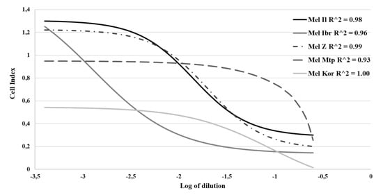 To calculate the ED50 values, real-time proliferation measurement by the xCELLigence instrument was used. Sigmoidal virus dose-response curves were plotted for the log-transformed values within 118–139 h of cultivation with high statistical reliability (R2 > 0.9), indicating ED50 dilution of input MV as 0.53, 0.008, 0.92, 0.598 and 0.089 CCID50/mL for mel Il, mel Ibr, mel Mtp, mel Z and mel Kor cell lines, respectively (Figure 3). Sigmoidal virus dose-response curves had different character depending on cell size and cell proliferation: the amount of cells was higher for mel Il, mel Z and mel Ibr cells comparing with mel Mtp and mel Kor cells at the time of virus inoculation (24 h). Thus, as the initial number of cells was similar for each cell line, the varying values of cell index at the virus inoculation time point indicated different proliferation rate of cell lines. Furthermore, for mel Mtp-infected cells, virus inoculation additionally inhibited their proliferation within the cultivation period. Moreover, cells varied in virus-induced death kinetics: as in MTT-test, mel Ibr cells were the most effectively eliminated cell line; for mel Il and mel Z the death kinetics were similar and had the classical sigmoidal character indicating the ED50 70-fold higher than for mel Ibr cells; for mel Mtp, the ED50 dilution of input MV was 1.7-fold higher than for mel Z and mel Il cells, 10-fold and 115-fold higher than for mel Kor and mel Ibr, respectively.