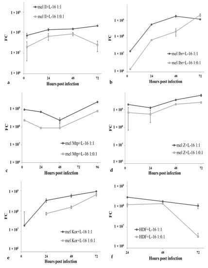 Replication of MV strain L-16 in melanoma cells and fibroblasts. Melanoma cells, mel Il (a), mel Ibr (b), mel Mtp (c), mel Z (d), mel Kor (e), or HDF (f) cells were infected with MV at a MOI of 1.0 (-○-) or 0.1 (-□-) and virus quantification was determined in cell lysates using the qPCR-RT method. The data shown are representative of three separate experiments and expressed in fold change. Fold change—FC, is an average value of threshold cycle (Ct) for MV intracellular RNA obtained for each sample, normalized to an average Ct value for house-keeping genes used: GAPDH, PGK1 and ACTB, measured for the same sample in parallel (∆Сt), and calculated relatively to normalized Ct value for the respective mock-infected cell line (∆∆Сt). The data represents the FC values between the level of MV RNA expression in MV-infected cells (∆∆Сt(+)) and infected with UV-inactivated MV cells (∆∆Сt(−)) for each time point, FC = 2−∆∆Сt(+)-2−∆∆Сt(−)].